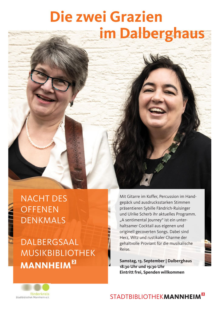 Mit Gitarre im Koffer, Percussion im Handgepäck und 2 ausdrucksstarken Stimmen präsentieren "Die singenden und swingenden Göttinnen von Odenwälder Anmut" ihr aktuelles Programm. - "A sentimental Journey" ist ein unterhaltsamer Cocktail aus originell bearbeiteten Pop-, Blues-, Jazz-Covers und eigenen Songs. Dabei sind Herz, Witz und rustikaler Charme der bekömmliche Proviant für die musikalisch-erzählerische Reise.
