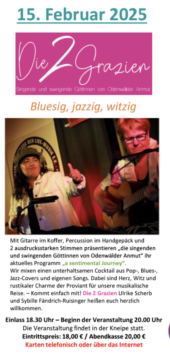 Nach dem ersten Konzert der “2 Grazien” vom Oktober 2024 fand anlässlich des Weltfrauentages am 08.03.2025 im Frauenkulturzentrum Darmstadt ein weiteres Gastspiel der “2 Grazien” statt. Ulrike Scherb und Sybille Fändrich-Rusinger begeisterten wieder das Publikum und boten sie eine tolle und mitreißende Show, die es wieder wert war, gesehen und erlebt worden zu sein.